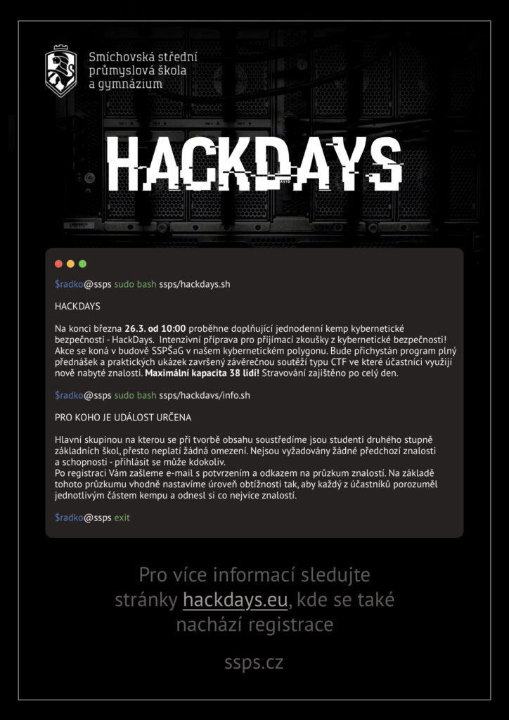 Zaregistrovaní se mohou, jako v jiných termínech, těšit na náš kybernetický polygon, nabitý program, občerstvení po celý den, soutěž typu CTF a prestižní certifikát o účasti na táboře.
